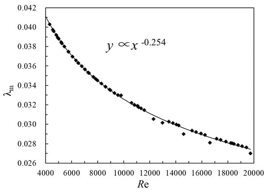 Taking the pipe set on the reverse slope as an example, test data at various gradients when hs = 4 m and d = 2 cm are used to deduce the formula of the resistance coefficient λm R herein. Figure 10 shows the relationship between the resistance λm R coefficient and the Re number under various gradients. As can be seen from the figure, the resistance coefficient of the gas–liquid two-phase flow decreases with the increase of the Re number, which is consistent with the variation law of the resistance coefficient with the Re number in common pressurized pipes. λm R is in inverse proportion to the Re number under various gradients, and it is derived from data fitting that λm R∝.