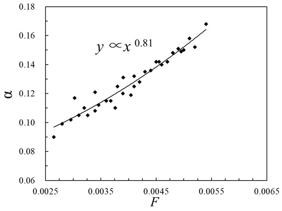 Set . In order to further study the relationship between F and the fraction α, the values of F and α obtained under various working conditions are drawn in Figure 11. It can be seen from the figure that α ∝ F0.881.