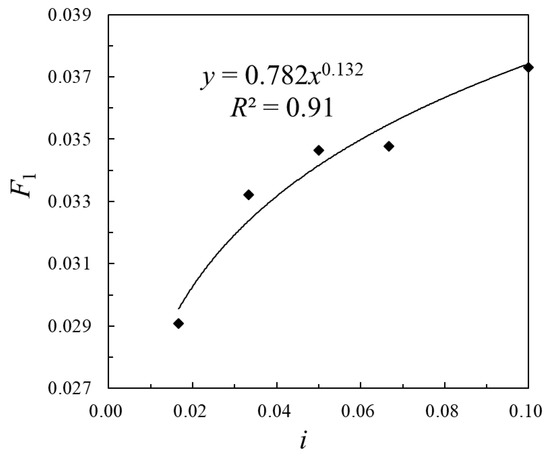 To further study the influence of the gradient i on λmR, set , and plot the relationship between F1 and five different slopes i, as shown in Figure 12. Formula (7) is obtained through curve fitting: