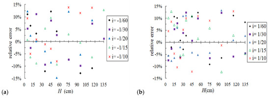 Relative error between the test value and the calculated value of the resistance coefficient: (a) pipes set on the reverse slope, (b) pipes set on the positive slope.