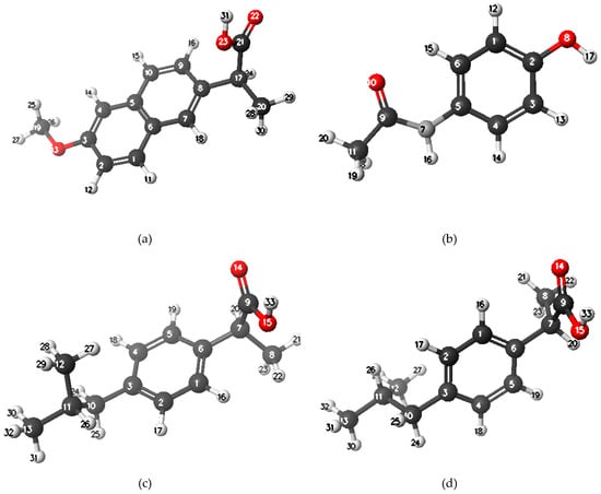 Optimized chemical structure of (a) (S)-naproxen, (b) paracetamol, (c) (S)-ibuprofen, (d) (R)-ibuprofen obtained by DFT calculation in Scigress program. Particular atoms were marked with colors: carbon—black, hydrogen—white, nitrogen—light gray, oxygen—red.