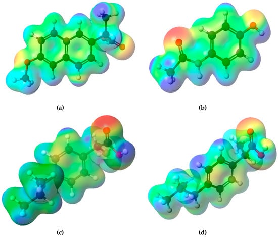 Electrostatic potential energy maps for (a) (S)-naproxen, (b) paracetamol, (c) (S)-ibuprofen, (d) (R)-ibuprofen. Blue surface indicates positive value of electrostatic potential (localized positive charge) and the red one—negative value (localized negative charge). Electron density at the surface is 0.01 e/A3.