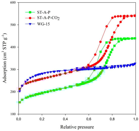Nitrogen adsorption isotherms measured at −196 °C are presented in Figure 3. According to IUPAC classification of adsorption isotherms [], experimental isotherms for the materials studied (ST-A-P and ST-A-P-CO2) are type-IV, which is characteristic of mesoporous solids. H1 hysteresis loops confirm the presence of accessible mesopores. Isotherm for the WG-15 carbon is type I, according to IUPAC classification of adsorption isotherms []. The type-I isotherm indicates high adsorption in the range of low relative pressures, i.e., refers to adsorbents with the highly developed microporosity (porosity, which forms pores with linear dimensions less than 2 nm). In the area of medium and high relative pressures, the isotherm for WG-15 carbon has a course almost parallel to the abscissae axis, which indicates that mesoporosity (pores with dimensions of 2 to 50 nm) is poorly developed []. The type-H4 hysteresis loop for WG-15 carbon is associated with narrow slit pores, but now includes pores in the micropore region.