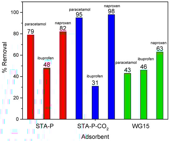 Removal efficiencies of paracetamol, ibuprofen, and naproxen by adsorbents ST-A-P, ST-A-P-CO2, and WG-15 are presented in Figure 5. The results show that new mesoporous carbon materials ST-A-P and ST-A-P-CO2 adsorb paracetamol and naproxen better than adsorbent WG-15 from aqueous solutions. The removal efficiency is 95% and 98% for paracetamol and naproxen, respectively, i.e., for adsorption on adsorbents activated by CO2. The adsorption of ibuprofen is comparable or weaker for ST-A-P, ST-A-P-CO2, and WG-15 adsorbents. The best results are obtained for adsorption on all the studied adsorbents for naproxen (82% ST-A-P, 98% ST-A-P-CO2, 63% WG-15).