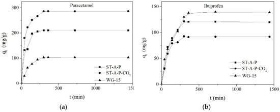 Adsorption kinetics for paracetamol, ibuprofen, and naproxen on ST-A-P, ST-A-P-CO2, WG-15 are shown in Figure 6a–c. The adsorption equilibrium was settled after 360 min for all the studied pharmaceuticals.