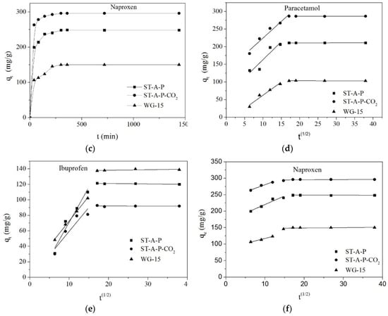 The values of kid1, kid2 and c1, c2 determined from the slopes and intercepts of the first and second linear part of graph (Figure 6d–f) are given in Table 7. Constant values kd1 decrease in the following order: paracetamol > ibuprofen > naproxen for ST-A-P and ST-A-P-CO2 adsorbents. For WG-15 adsorbent, the following range was obtained: paracetamol ≈ ibuprofen > naproxen. In turn, for all the studied adsorbents, the rate of diffusion is the smallest for naproxen, i.e., for the adsorbate of the highest molecular weight.