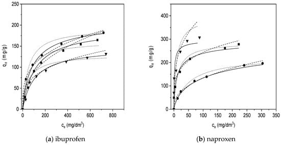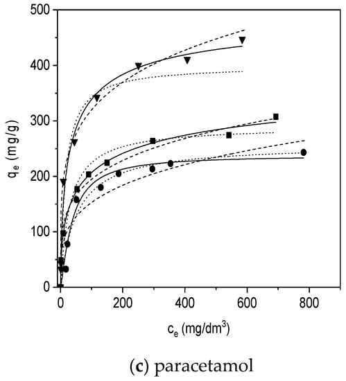 Freundlich, Langmuir, and Langmuir-Freundlich models were employed to analysis adsorption data obtained in experiments. Temkin isotherm model, taking into consideration the effects of indirect adsorbate/adsorbate interactions during the adsorption process, assumes that adsorption heat of all molecules in the adsorption layer decreases linearly with increasing coverage of adsorption surface only for an intermediate range of concentrations [,,]. Adsorption isotherms were determined for initial concentrations of paracetamol, ibuprofen and naproxen from 50 to 700 mg dm−3. That is why it was decided that the Temkin model is not suitable for our experimental conditions.