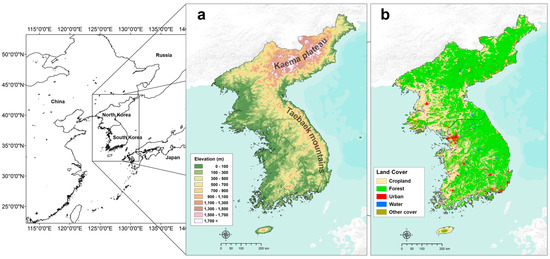 The Korean Peninsula has a temperate monsoon climate with hot and humid summers and cold, dry winters. The average annual temperature is 10–16 °C and the annual precipitation is about 1000–1400 mm [20]. Geographically, the northern part of the Kaema Plateau and the Taebaek mountain range on the east coast are major mountainous areas, and plains are widely distributed around the west coast [20,21] (Figure 1).