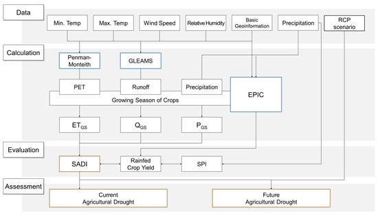 The EPIC model is a widely used crop model worldwide, and it has been applied in many studies on the Korean Peninsula [21,23,33,34,35]. In this study, the EPIC crop model was used for gridded estimation of crop phenology using the parameters of optimum climate conditions (see later) and for gridded estimation of rainfed crop yield to evaluate the performance of the SADI.