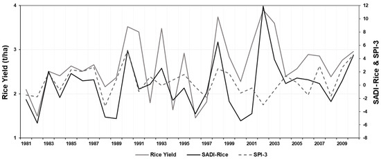 Annual comparison of the Standardized Agricultural Drought Index for rice (SADI-Rice), three-month Standardized Precipitation Index (SPI-3), and rainfed rice yield (1981–2010).