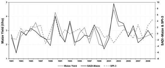 Annual comparison of the Standardized Agricultural Drought Index for maize (SADI-Maize), three-month Standardized Precipitation Index (SPI-3), and rainfed maize yield (1981–2010).