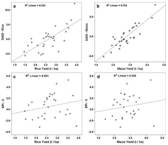 Linear regression for the Standardized Agricultural Drought Index (SADI), three-month Standardized Precipitation Index (SPI-3), and crop yield ((a): SADI-Rice and rainfed rice yield, (b): SADI-Maize and rainfed maize yield, (c): SPI-3 and rainfed rice yield, and (d): SPI-3 and rainfed maize yield).
