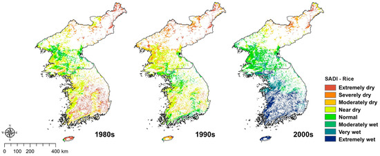 The SADI-Rice calculated for all regions on the Korean Peninsula demonstrated that the spatial patterns changed over time. Initially, in the 1980s, North Korea was wetter than South Korea during the rice growing season, but this was reversed in the 1990s (Figure 6). In particular, the northern part of North Korea showed widespread, severe drought conditions in the 1990s. In the 1990s, North Korea suffered from a significant food problem, which was called the Arduous March. In the 2000s, overall wet conditions were observed, and the extremely wet area was very wide in South Korea. However, in North Korea, dry conditions were still widely distributed in the northern area. The average SADI over the 30 y identified the southern part of the peninsula as the wettest region and the northern part as the driest (Figure 5). The SADI was found to have a larger annual spatial variation when compared with the previously applied drought indexes at the same regions, such as the SPI, PDSI, and SPEI [8,10,11,50].