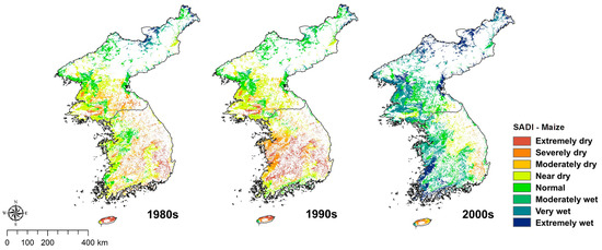 The spatial patterns for the SADI-Maize also varied with time (Figure 7). In the 1980s, it was dry in the inland area and relatively wet in North Korea. In the 1990s, the severely dry region was widespread in South Korea, and, as in the 1980s, North Korea showed wetter conditions. In northern North Korea, which is known to be disadvantageous for agriculture owing to the temperature distribution, most areas had wet conditions that were greater than medium. In the 2000s, overall wet conditions were observed throughout the Korean Peninsula, and dry conditions were only observed in some inland and island areas. The northern part of the Korean Peninsula was wetter during the maize growing season than the southern regions based on the three decades average (Figure 7).