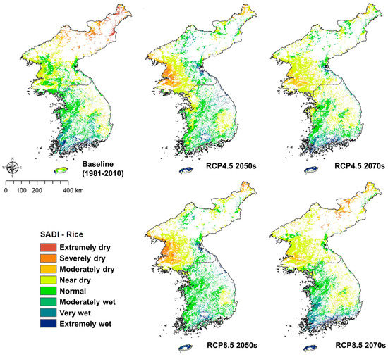 In the case of the SADI-Rice, South Korea was significantly wetter in the baseline period compared to North Korea, and the west coast was wet compared to inland and northern regions (Figure 8). For the RCP 4.5 scenario in the 2050s, the wet area of South Korea appeared to be widening, but in the case of North Korea, moderately and severely dry areas were found to be widespread in the western plain, which is the most important granulous area. For the RCP 4.5 scenario in the 2070s, the wet region in South Korea decreased and the dry region in North Korea decreased. This tendency was similar in the RCP 8.5 scenario at the 2050s and 2070s, respectively. Nevertheless, the dry area of North Korea for the RCP 8.5 scenario was more widespread than the RCP 4.5 scenario. Overall, dryness decreased in the northern part of the Korean Peninsula where the dry region was widespread in the baseline period, and the increase in dryness in the western part of North Korea was significant.