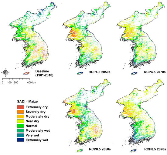 In the case of the SADI-Maize, the baseline period was found to be wetter in North Korea than in South Korea, and dry regions were found in the inland and island areas (Figure 9). For the RCP 4.5 scenario in the 2050s, the wetness increased in the South compared with that in the baseline period, and moderately and severely dry areas in the western plain were found to be widespread in North Korea. This tendency was similar in the RCP 8.5 scenario. In the 2070s, wet conditions increased in South Korea’s southern coastal and island areas, while severely dry areas in North Korea decreased, but nearby dry regions increased. In the case of Jeju Island, which is basaltic, water resources are limited in agricultural areas, and wet conditions are caused by the increase in overall precipitation.