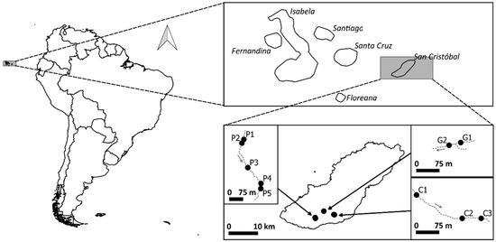 The Galapagos archipelago is about 3 to 5 million years old and consists of 13 major and 7 minor islands, consisting of a land area of about 8000 km² [4,28]. Only four islands are permanently inhabited: San Cristóbal, Santa Cruz, Isabela, and Floreana, with the first being the oldest island and containing the only significant permanent source of fresh water within the archipelago [28]. Additionally, small brooks can be found year-round on San Cristóbal, running from the highlands toward the ocean.