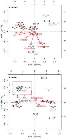 Relatively low conductivity values were observed, ranging from 69 up to 156 µS cm−1 in 2016 and between 34 and 130 µS cm−1 in 2017, while pH fluctuated around 7.5 on the National Institute of Standards and Technology (NIST) scale (overall range between 6.06 and 8.51). The lowest dissolved oxygen (DO) concentration (4.62 mg O2 L−1) was observed in site G1 in 2017, but it was mostly higher than 6 mg O2 L−1. Turbidity ranged from 2.6 up to 46.4 NTU in 2016, but presented a narrower range in 2017 (4.1 up to 23.7 NTU). In contrast, COD was characterized by a wider range in 2017 (5.8–21.2 mg O2 L−1) compared to 2016 (2.7–9.2 mg O2 L−1). Ammonium levels were often below the detection limit (0.010 mg N L−1; five sites in 2016, four sites in 2017), as were nitrate levels in 2016 (0.1 mg N L−1; nine sites) and orthophosphate levels in 2017 (0.0025 mg P L−1; nine sites). Consequently, nitrate and orthophosphate were excluded from the data, which were subsequently normalized prior to principal component analysis (PCA). The resulting primary and secondary axes explained 32% and 20% of the overall variance, respectively, with pH, DO, and turbidity negatively correlated with the first axis (−0.57, −0.51, and −0.46, respectively), while conductivity and temperature were negatively correlated with the second axis (−0.62 and −0.55, respectively). A summary of the observed range and mean values is provided in Table 1, while the abiotic-based PCA can be found in Figure 2A.