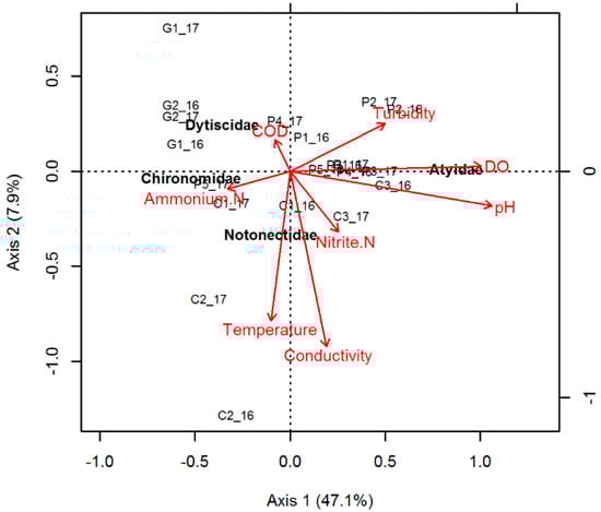 The combination of both datasets (abiotic and biotic) showed (after applying a redundancy analysis) a pattern similar to Figure 2B, with overlaid environmental gradients allowing for the inference of potential relationships between prevailing macroinvertebrate dominance and abiotic conditions. For instance, an increase in DO and/or pH had a positive effect on the Atyidae count and was, consequently, negatively correlated with the Chironomidae count (Figure 3). Similarly, an increase in conductivity and/or temperature had a positive effect on Notonectidae presence, while in contrast, reduced values of DO (and/or pH) and conductivity (and/or temperature) provided better conditions for Dytiscidae (Figure 3). The presence of Atyidae was linked to higher DO and pH values, while Chironomidae was linked to increased values of ammonium as well as reduced values of DO and pH (Figure 3). The primary axis of this constrained analysis explained 47% of the overall variance, while the secondary axis explained an additional 8%, and yet only the first axis was found to be significantly important (ANOVA permutation, p = 0.004), suggesting a relatively high importance of DO in defining the prevailing macroinvertebrate community within the sampled sites.
