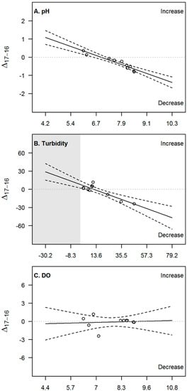 Linear regression lines depicting the change in abiotic variables between 2016 and 2017. Open circles represent the sample sites, the solid black line the fitted trend, and the dotted black lines the confidence (95%) related to it. (A) pH (-); (B) turbidity (NTU); (C) dissolved oxygen (DO, mg L−1). Both pH and turbidity values were characterized by a significant slope (−0.49 and −0.66, respectively, both p < 0.001). The depicted x-range covered 2.5 times the initial range, thereby including negative values (gray zones).