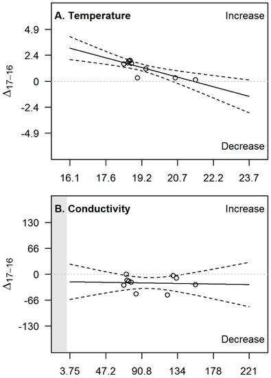 Linear regression lines depicting the change in abiotic variables between 2016 and 2017. Open circles represent the sample sites, the solid black line the fitted trend, and the dotted black lines the confidence (95%) related to it. (A) Temperature (°C); (B) conductivity (µS cm−1). Only temperature differences were characterized by a significant slope value (−0.59, p = 0.003). Conductivity values in 2017 were significantly lower than values recorded in 2016 (p = 0.002). The depicted x-range covered 2.5 times the initial range, thereby including negative values (gray zones).