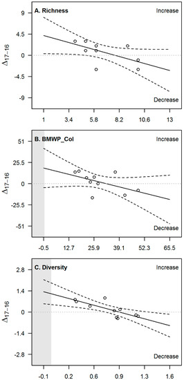 Linear regression lines depicting the change in biotic metrics between 2016 and 2017. Open circles represent the sample sites, the solid black line the fitted trend, and the dotted black lines the confidence (95%) related to it. (A) Richness; (B) Biological Monitoring Working Party (Colombia) (BMWP_Col); (C) diversity. Only diversity values showed a significant negative slope (−1.30, p = 0.008). The depicted x-range covered 2.5 times the initial range, thereby including negative values (gray zones).
