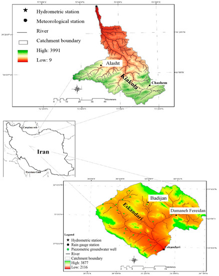 This catchment with an area of about 2100.9 km2 and elevation between 9–3991 m above sea level, is located in 35°44′ to 36°19′ latitudes and 52°35′ to 53°23′ longitudes, in the Mazandaran province, in northern Iran (Figure 1, up). The type of precipitation (about 700 mm per year) is snow and rainfall in the mountainous and plain sectors, respectively. Most precipitation occurs in winter. July, with 27 mm of rainfall, is the driest month and the most precipitation, with an average of 177 mm falls in October. In the Mazandaran province, there are too many wetlands which have been exposed to drought because of climate change and anthropogenic activities. The main anthropogenic activities are land use change and over-extraction of surface and sub-surface water resources. In the past two decades, the forest area has decreased and Kiakola catchment as a part of the Talar watershed has been one of the most affected areas due to rapid urbanization and population growth. In addition, high demand for fuel and food, increasing the smuggling of timber and livestock grazing, development of road and cities, mine exploitation and factory construction have been recognized as the main human activates in this area. Changing the forest to grassland and grassland to residential sites has become one of the most major concerns in this area. The land-use maps of 2000 and 2011 have shown that the area of rangelands and forest lands has decreased and been converted into the residential, garden and agricultural land (for rice cultivation) [19,20]. The demand for rice production in Iran is increasing, while rice cultivation requires a high level of water depth at every growth stage. However, the occurrence of hydrological drought can alter the amount of rice which is needed to supply food demand [21].
