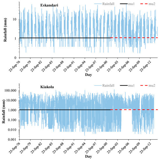 The non-parametric Pettitt’s test approach [38] was applied to detect the point of change in time series that separates the whole period into the undisturbed and disturbed periods. Pettit’s test can identify whether two selected data samples belong to the same population based on the mean value of time series and the Mann–Whitney statistic. This test was applied to the time series of rainfall and flow discharge for both the Eskandari and Kiakola catchments. As a result, the study period was divided into the disturbed and natural periods with and without significant human interventions, respectively.