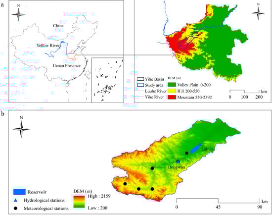 Yihe River, situated in Luoyang City, Henan Province, in the central part of China (33°39′–34°41′ N, 111°19′–112°54′ E), originates from the Xionger Mountains, traveling 268 km from southwest to northeast with an average annual streamflow of 368 million cubic meters and flows across Luachuan, Songxian, Yichuan, and Yanshi counties before draining into the Yellow River and converging with the Luohe River (Figure 1a). The study area is subject to a temperate continental monsoon climate with hot-rainy summers and cold-rainless winters, accompanied by a mean annual temperature of 13 °C and a mean annual precipitation of 800 mm, mainly occurring during the rainy season from July to September. Land use types are dominated by forest and cultivated land, accounting more than 50% and 30%, respectively, followed by less than 10% of grass and built-up land areas. The reservoir, built in 1959, was located in the lower part of the watershed with a total storage of 1320 × 106 m3. It has played an important role in irrigation, flood control, and water supply around the area. This region covers an area of about 5538 km2 and is composed of mountains, hills, and plains, with elevations of 200–2159 m [47]. The mountainous area is generally confronted with the acute contradictions between more population and less land, followed by land fragmentation with human interference. In order to highlight the hilly watershed and reduce the limitation of available data, we selected the upper part of this watershed, mainly encompassing hills and mountains, as the study area (Figure 1b).