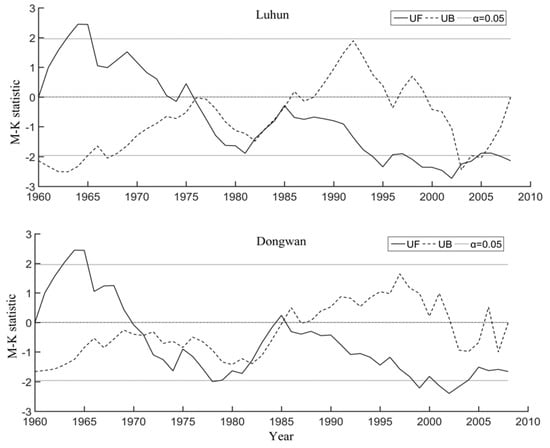 The results indicated that streamflow in the two stations generally experienced a downward trend after 1985, and it was significant after 1993 in Luhun and 1998 in Dongwan for most values outside the confidence interval. It also can be seen that two intersections appeared within the confidence intervals for the two stations. One fell in 1976 for Luhun and 1972 for Dongwang, and the other occurred in both stations in 1985. Since almost no uf values in the nearly 10 years from 1972 to 1985 surpassed the 95% confidence level for the two stations, it is appropriate to define 1985 as the change point after which the streamflow showed an overall declined.
