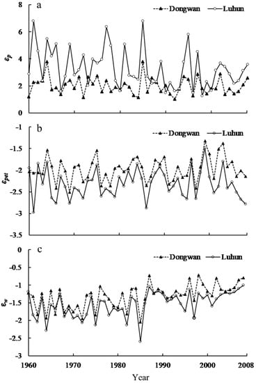 To further estimate the temporal evolution of the impacts of climate variation and land use change on streamflow, the annual sensitivity coefficients for the period of 1960–2008 for the two stations were obtained (Figure 3). The change magnitude for absolute values of εp and εpet in Luhun was greater than that in Dongwan (Figure 3a,b), which suggests that streamflow became more sensitive to climate variation in Luhun but less sensitive in Dongwan. The change magnitude for absolute values of εw exhibited a similar trend to that of climate variables (Figure 3c), indicating that the sensitivity of the streamflow to land use change in Luhun was greater than that in Dongwan.