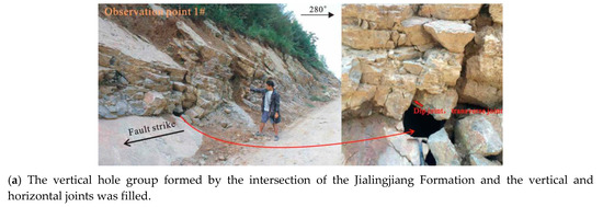 Secondly, it is generally believed that the development of fractures in the two sides of a simple reverse fault is relatively small, especially in the fault footwall, where the development of fractures is the lowest and water abundance is poor [21]. However, as shown in Figure 2d, when a certain scale of thrust faults (such as faults with a length of more than ten kilometers or even dozens of kilometers) are under the action of rotating compressive stress (mainly NE–SW compression, and even E–W and N–S compression superimposition [19]), the rock mass structure is unstable. We randomly selected fractures to measure their aperture. According to the authors of [22], the cracks at the outcrop showed good opening degrees, most of which were medium-wide to very wide (see Table 1). In addition, most of them had no filling—or occasionally, a soluble salt filling—in the tunnel, and thus were easy to break and had low strength and poor water resistance (Figure 4). As the depth increased, the aperture grade of the fracture decreased.