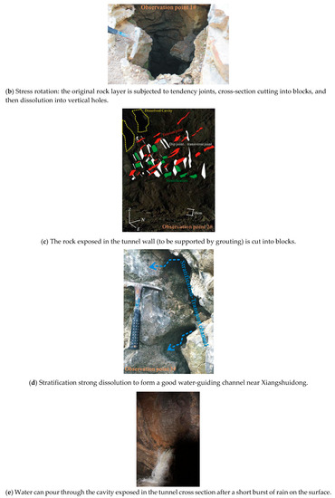 During the outcrop survey, it was also found that the horizontal karst was not easily formed in a certain range of the surface and was easily filled with mud (Figure 5a), mainly developing vertical corrosion holes (Figure 5b). In the field, we used a geological hammer to hit the tunnel, which would easily lead to a large amount of falling pieces and randomly mixed small dissolved cavities (Figure 5c). As found through observation in the tunnel crossway, even in the presence of concrete lining, this cross-cutting mode is prone to falling blocks, poor self-stability, and severe water seepage in some crack surfaces, among which tensile cracks and bedding faces have obvious strong corrosion (Figure 5d). The extensive development of this bedding karst structure provides good space conditions for groundwater storage and migration. From structural characteristics, it can be summarized as: the rock mass near the surface of the fault zone has a granular structure, the stability is poor, and it is easily filled (Figure 5a). However, in the block cracking structure of the tunnel, the rock mass can be self-stabilized and the conditions for hole formation are good (Figure 5c,d): the bedding expands laterally to form a larger cavity, where water surges through the tunnel quickly after heavy rain (Figure 5e,f). The stability of the block structure is the best, and generally not conducive to the formation of a good channel.