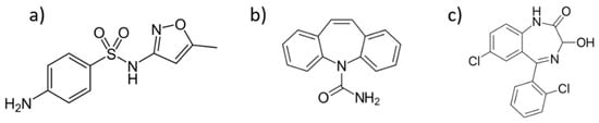 Molecular structure of (a) sulfamethoxazole, (b) carbamazepine and (c) lorazepam.