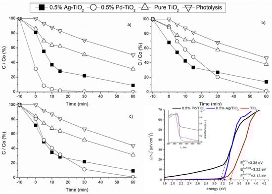 In the photocatalytic experiments, the photocatalysts were put in contact with the pollutants mixture for 10 min in dark conditions to test their adsorption capacity. SMX (Figure 4a) presented high adsorption capacity onto 0.5%Pd–TiO2 with up to 70% of reduction. The use of sunlight aided by 0.5% Pd–TiO2 was able to totally remove this contaminant in 15 min. Generally, the catalysts were able to enhance the degradation of all contaminants compared with photolysis. Pure TiO2 revealed the lowest degradation rate for all compounds compared with the doped photocatalysts, which was attributed to its absorbance ability in comparison to Pd–TiO2 and Ag–TiO2. As can be seen in the insert in Figure 4d, TiO2 was able to absorb wavelengths below 400 nm, while doped photocatalysts shifted the absorbance above 400 nm. Moreover, it was determined that the band gap of modified photocatalysts is lower than that of TiO2 (3.38eV). The reduction of the band gap to 3.13 eV and 3.22 eV for Pd–TiO2 and Ag–TiO2, respectively, confirmed that Pd–TiO2 has a higher visible light absorption ability (Figure 4d). Ag- and Pd-doped TiO2 showed a capacity to promote almost total contaminant removal after 1 h of photocatalytic oxidation. Among them, 0.5%Pd–TiO2 was the most efficient photocatalyst. The presence of noble metals can be helpful to enhance the visible light absorption due to surface plasmon resonance [15,16]. This means that the photogeneration of holes and electrons can occur with low energy sources, in contrast to pure TiO2. On the other hand, these noble metals can promote better electron–hole pair separation due to the electronegativity which can trap the electron, thus reducing the recombination phenomena [14,25,32]. Moreover, the next sections elucidate the effect of different kinds of wavelengths on the photocatalytic oxidation efficiency.