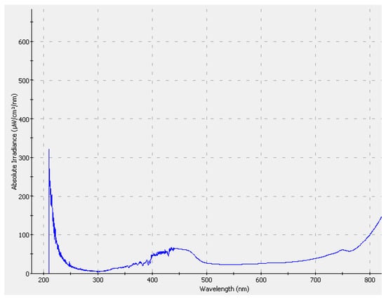 Photolysis led to a reduction of about 50% of the initial concentration of each contaminant in 60 min (Figure 4). This is a similar result to that obtained by Zanella et al. [33], who verified, using simulated sunlight radiation (Suntest CPS + device 280–800 nm with an irradiance flux of 500 W/m2) for 60 min, that the initial concentration of SMX (30 mg/L) could be reduced by half. Still, the pollutant initial concentration was very different in both works. However, even if in our study the initial load of SMX was 30 times lower, it must be considered that we are dealing with a mixture of three different contaminants. Moreover, the radiation flux used by Zanella et al. [33] was slightly higher. The main reason for such high contaminant degradation with sunlight radiation was determined to be the presence of UVB radiation in the sunlight spectrum (Figure 5).