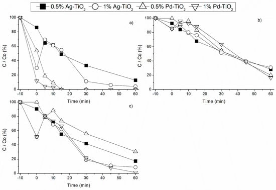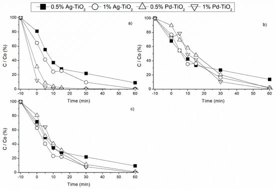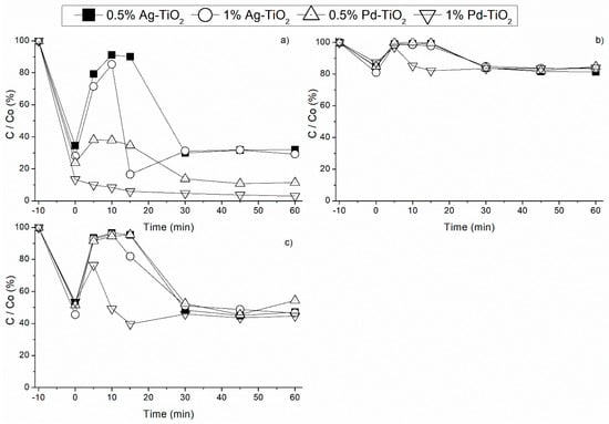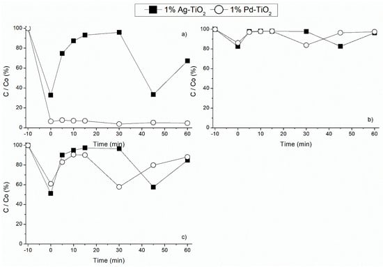 SMX (Figure 9a) removal for all catalysts was found to be closely related to the initial adsorption on their surface. For instance, with 1%Ag–TiO2 in the period of 10 and 15 min, a desorption phenomenon and the subsequent SMX concentration abatement were verified, indicating that the degradation occurred via oxidation instead of adsorption. In fact, Pd achieved a high initial SMX removal after 10 min of contact under dark conditions due to adsorption, which increased with the increasing noble metal load. The worst result for the contaminant degradation was achieved for 0.5%Ag–TiO2, where the removal rate reached about 90%, while for the other photocatalysts total contaminant abatement was obtained.