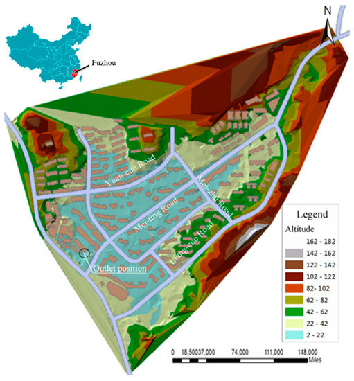 The area analyzed in this paper is located in the western suburb of Fuzhou, China, with a catchment area of about 0.217 km2, a permanent population of about 40,000. Referring to 1985 national elevation benchmarks, the lowest and highest ground elevation is 6.0 m and 123.4 m, respectively (Figure 1). The land block type in this area is mainly residential land and the drainage system is the interceptive confluent system, however, the mixed connection of rain and sewage in this area is quite serious. In addition, in the study area, the drainage pipe network of DN600 and above is about 9.27 km and the drainage is collected in the main channel with a width of 3 m, a height of 2 m and a total length of about 1000 m through 5 branch pipes. The height of the inner bottom of the discharge outlet pipe at the end of the area is about 5.7 m from the ground.