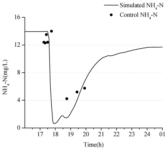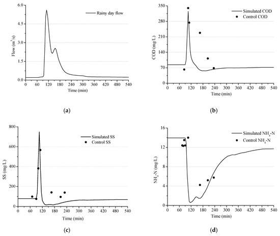 The main fitting water quality indexes of dry sewage are SS, COD, TN, TP and NH4-N. In this paper, the measured rainfall time was in the afternoon and notably, the value of TN, NH4-N in the morning and afternoon differed over 200%. Therefore, the measured mean value in the afternoon was adopted and the measured mean value in the whole day was adopted for other indexes. The simulated value and control value are shown in Table 2. The reason why the value C is significantly higher in comparison with other SS is that the combined rainwater in this area is very heavy and the effluent is greatly affected by the surrounding mixed sewage. Therefore, due to the existence of restaurants and car washes around the test site, there will be a large amount of wastewater flowing into the pipe from 12:00 to 2:00, resulting in an obvious increase of SS value.