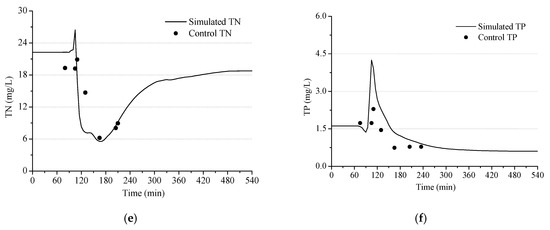 Simulation curves and measured values of each pollution index, (a) flow, (b) chemical oxygen demand (COD), (c) suspended solid (SS), (d) ammonia nitrogen (NH4-N), (e) total nitrogen (TN), (f) total phosphorus (TP).