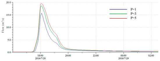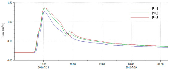 According to Figure 6, the trend of the interception flow curve was similar to that of the terminal discharge outlet confluence curve and the water volume reached the maximum around 18:05. In addition, with the increase of rainfall intensity, the closure volume increased correspondingly.