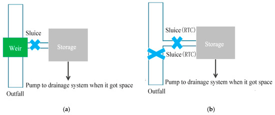 (a) Schematic diagram of simulation of traditional interception strategy; (b) Water quality interception strategy based on the pollution concentration of mixed rainwater.