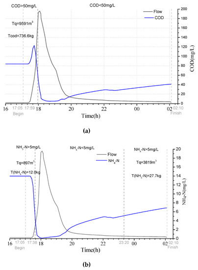 Process of COD (a) and NH4-N (b) pollution with return period of 5 years.