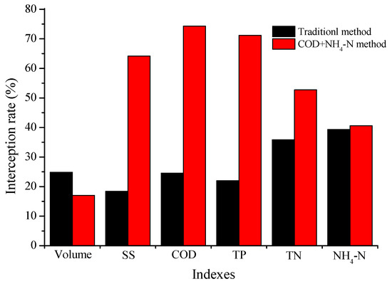 According to Table 9, the average intercepting rate of all pollutants based on the COD + NH4-N interception strategy was 60.6%−84.1%, which was about 10.9%−56.1% higher than the traditional interception strategy and significantly improved the closure effect. Meanwhile, the closure water volume of the COD + NH4-N interception was lower than that of the traditional interception weir and the decreased amount was about 1432−6154 m3, which can effectively reduce the closure construction cost. Moreover, as shown in Figure 8, compared with the traditional interception weir, the closure water volume with the interception strategy based on the combination of COD + NH4-N decreased by 7.82% and the closure rate of this combined interception strategy to all pollutants increased, especially the SS, COD and TP which respectively increased by 45.73%, 49.70% and 49.15%, resulting in the significant improvement of the intercepting efficiency. In summary, the combined COD + NH4-N intercepting strategy was better than the traditional intercepting weir in both control effect and economic efficiency.