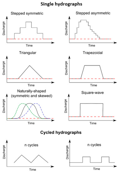 The hydrographs applied in experimental studies vary in shape, duration, flow magnitude, time-to-peak flow, and proportion between rising and falling limb duration, so as to model various types of flood waves occurring in natural conditions (Figure 1). Triangular [13], trapezoidal [23], and step-wise [24,25,26] hydrographs have been considered. Other researchers have designed more naturally-shaped hydrographs in the form of smooth curves [27,28,29]. The duration of hydrographs has varied from a few minutes [12] to a few hours [5]. Cycled hydrographs have been designed to model the influence of successive floods or other unsteady flow events on the bed texture and sediment transport [11,25,27,30,31,32,33].