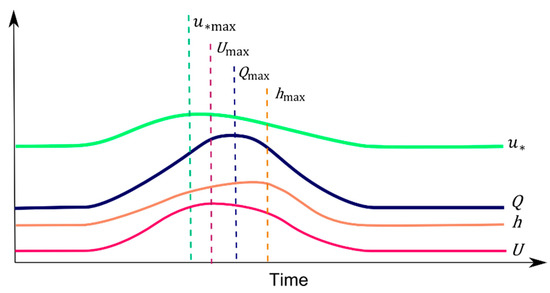 Schematic representation of temporal variation of flow parameters, indicating the sequence of peak values. Based on [56,61], u*max—maximum friction velocity (m/s), Umax—maximum mean flow velocity (m/s), Qmax—maximum flow rate (m/s), hmax—maximum flow depth (m).