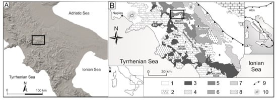 (A) Location of the study area in the frame of the southern Italian landscape. (B) Geological sketch map of the southern Apennines. The study area is represented in the box. Legend: (1) Pliocene to Quaternary clastic deposits and volcanic products; (2) Miocene syntectonic deposits; (3) Cretaceous to Oligocene ophiolite-bearing internal units; (4) Mesozoic–Cenozoic shallow-water carbonates of the Apennines platform; (5) lower–middle Triassic to Miocene shallow-water and deep-sea successions of the Lagonegro-typeMonte Arioso unit; (6)Mesozoic to Miocene deep-sea successions of the Lagonegro-type Groppa d’Anzi unit; (7) Cretaceous to Miocene deep-sea successions of the Lagonegro-type Campomaggiore unit; (8) Mesozoic–Cenozoic shallow-water carbonates of the Apulian platform; (9) thrust front of the chain; (10) volcanoes.