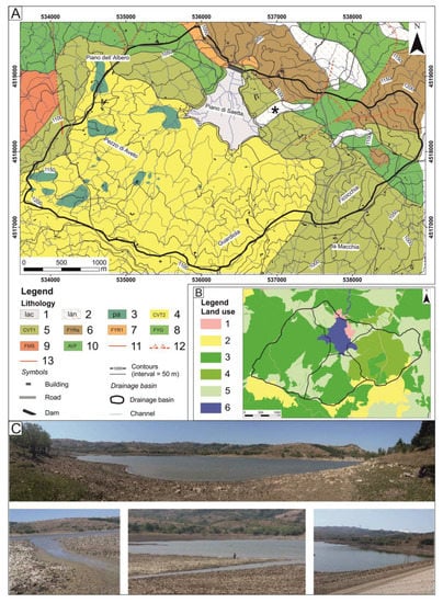 Physical features of the study area. (A) Geological map of the study area (modified from []). Legend: (1) Fine-grained sediments of lacustrine environment (lac, Holocene) (2) Landslide deposits (lan, Holocene) (3) Decametric blocks of mudstone (pa, Upper Miocene); (4) Silt and marly clay (CVT2, Upper Miocene); (5) Coarse- to medium-grained light brown sandstone with rare intercalation of 1 to 6 thick lens of polygenic conglomerate (CVT1, Upper Miocene); (6) Calcareous breccia and grey shale (FYRa, Lower Cretaceous-Oligocene); (7) Chert, marly clay with intercalation of calcarenites and calcareous breccia (FYR1, Lower Cretaceous-Oligocene); (8) Light-grey and greenish shale with intercalation of thin beds of marls and marly limestone (FYG, Lower Cretaceous); (9) Alternance of calcarenite, calcilutite with nodular chert and varicoloured clay (FMS, Upper Cretaceous-Eocene); (10) Varicoloured clay (AVF, Lower Cretaceous); (11) High-angle fault (dashed if uncertain); (12) Thrust (dashed if uncertain); (13) Stratigraphic contact. The asterisk highlights a landslide representing a probable key-element in reservoir sediment flux. (B) Land use map. Legend: (1) Anthropic surfaces and roads; (2) Arable lands; (3) Sclerophyllous vegetation; (4) Broad-leaved and mixed forests; (5) Natural grasslands; (6) Water courses and water bodies. (C) Panoramic views showing the artificial reservoir and the surrounding sectors.