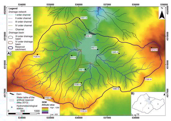 Landscape features of the study area are strictly related to the tectonic evolution and relief growth of this sector of the chain, which controlled in turn the distribution of the outcropping deposits. Landscape is featured by E–W trending morpho-structural ridges and thrust sheets, which are mainly carved in Cretaceous-to-Miocene pelagic deposits (Figure 2a). These landforms are transversally incised by a IV-order drainage basin (i.e., the Ficocchia stream), located in the right-side of the Ofanto river at an altitude ranging from 942 and 1242 m a.s.l. (Figure 3). The drainage basin of the artificial reservoir includes three small catchments of low hierarchical order, which are arranged in a sub-dendritic pattern. Drainage divide of the catchment of the southern sector shows an elongate shape and is developed on a gentle topography related to remnants of low-relief erosional land-surfaces []. Headwater channels of the southernmost sectors exhibit a moderate degree of hierarchization (Figure 3) and are featured by a higher gradient than the lower reaches. Fluvial processes related to the channel incision are the main geomorphological processes of the study area and represent the main controlling factors of the sediment flux. In fact, minor shallow landslides and small earthflows can be only observed in the eastern sectors of the catchment, where clay-rich lithological units crop out.