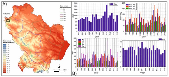 Regional and local climate setting. (A) Climate map of the Basilicata region showing the mean annual temperature and rainfall for the 1951–2010 period (Source: Pescopagano weather station); (B) Precipitation indices deriving by the hourly rainfall record of the dam weather station. Legend: Ptot: annual rainfall; annual maximum rainfall for 1 (P1), 3(P3) and 5(P5) days. Wi: Winter; Sp: Spring; Su: Summer; Au: Autumn. SDII: simple daily intensity index representing the ratio between the total annual precipitation and the number of annual rainy days.